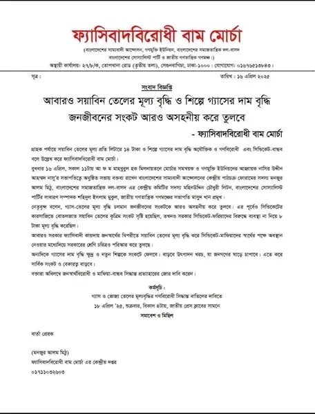 ফ্যাসিবাদবিরোধী বাম মোর্চা সংবাদ বিজ্ঞপ্তি আবারও সয়াবিন তেলের মূল্য বৃদ্ধি ও শিল্পে গ্যাসের দাম বৃদ্ধি জনজীবনের সংকট আরও অসহনীয় করে তুলবে। April 16, 2025 0 comments ফ্যাসিবাদ বিরোধী বাম মোর্চা Share this:Post Share on Threads (Opens in new window) Threads Share on WhatsApp (Opens in new window) WhatsApp Share on Telegram (Opens in new window) Telegram Email a link to a friend (Opens in new window) Email Print (Opens in new window) Print Like this:Like Loading...