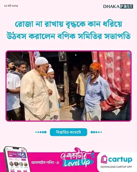 গতকাল শ্রমিক এলাকায় নিয়মিত কাজে গিয়েছিলেন আমাদের বন্ধুরা। সেখানে কয়েকজন শ্রমজীবী বন্ধু ছিলেন। তারা সবাই ধার্মিক। কিন্তু জিজ্ঞাসায় জানা গেল তারা কেউই রোজা করেননি। আমাদের অভিজ্ঞতা হচ্ছে, কঠোর কায়িক শ্রম করেন এমন মানুষ সাধারণত রোজা করেন না, কারণ করতে পারেন না। বণিক সমিতির সভাপতির মত মেদ তাদের থাকে না। তাদের খেতে হয়। এই শ্রমজীবীরাই রোজার মাসে পর্দা ঘেরা রাস্তার খাবারের দোকানে ভীড় করেন। এই ব(ণি)ক ধার্মিক তা কীভাবে বুঝবে? সে লাঠি হাতে গরীব মেহনতিদের “হেদায়েত” করতে নেমেছে। চরম অবমাননা করছে মানুষগুলোকে।
