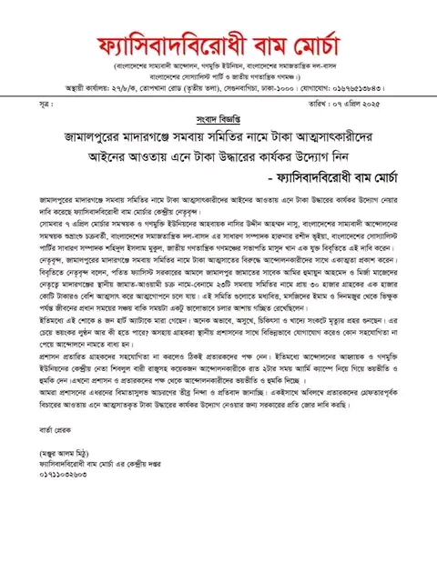 জামালপুরের মাদারগঞ্জে সমবায় সমিতির নামে টাকা আত্মসাৎকারীদের আইনের আওতায় এনে টাকা উদ্ধারের কার্যকর উদ্যোগ নেয়ার দাবি করেছে ফ্যাসিবাদবিরোধী বাম মোর্চার কেন্দ্রীয় নেতৃবৃন্দ।