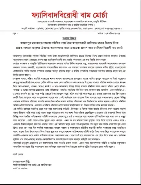 জামালপুর মাদারগঞ্জে সমবায় সমিতির নামে টাকা আত্মসাৎকারী জালিয়াত চক্রের বিরুদ্ধে নিঃস্ব-সাধারণ মানুষের ঐক্যবদ্ধ আন্দোলনের সঙ্গে একাত্মতা প্রকাশ করে ফ্যাসিবাদ বিরোধী বাম মোর্চা
