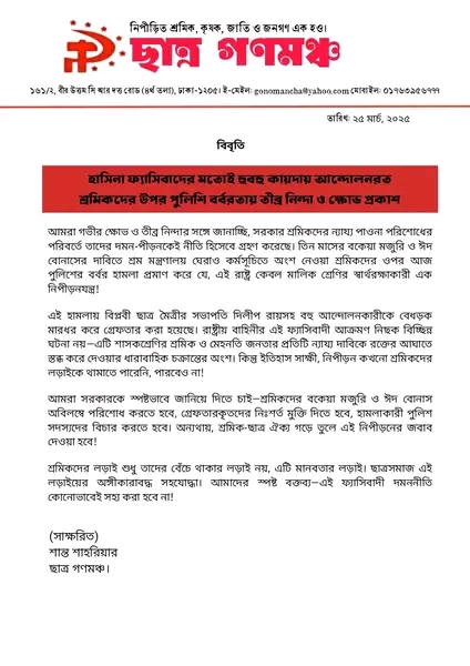 শ্রমিকদের লড়াই শুধু তাদের বেঁচে থাকার লড়াই নয়, এটি মানবতার লড়াই। ছাত্রসমাজ এই লড়াইয়ের অঙ্গীকারাবদ্ধ সহযোদ্ধা। আমাদের স্পষ্ট বক্তব্য—এই ফ্যাসিবাদী দমননীতি কোনোভাবেই সহ্য করা হবে না!