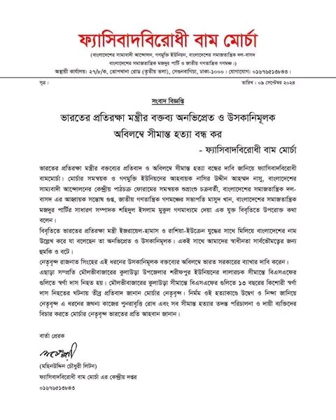 ফ্যাসিবাদবিরোধী বাম মোর্চা সংবাদ বিজ্ঞপ্তি ভারতের প্রতিরক্ষা মন্ত্রীর বক্তব্য অনভিপ্রেত ও উসকানিমূলক, অবিলম্বে সীমান্ত হত্যা বন্ধ কর। September 9, 2024 0 comments Share this:Post Share on Threads (Opens in new window) Threads Share on WhatsApp (Opens in new window) WhatsApp Share on Telegram (Opens in new window) Telegram Email a link to a friend (Opens in new window) Email Print (Opens in new window) Print Like this:Like Loading...