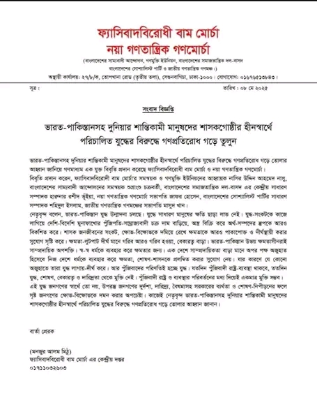 ফ্যাসিবাদবিরোধী বাম মোর্চা সংবাদ বিজ্ঞপ্তি ভারত-পাকিস্তানসহ দুনিয়ার শান্তিকামী মানুষদের শাসকগোষ্ঠীর হীনস্বার্থে পরিচালিত যুদ্ধের বিরুদ্ধে গণপ্রতিরোধ গড়ে তুলুন May 8, 2025 0 comments [ ফ্যাসিবাদ বিরোধী বাম মোর্চা, নয়া গণতান্ত্রিক গণমোর্চা ] Share this:Post Share on Threads (Opens in new window) Threads Share on WhatsApp (Opens in new window) WhatsApp Share on Telegram (Opens in new window) Telegram Email a link to a friend (Opens in new window) Email Print (Opens in new window) Print Like this:Like Loading...