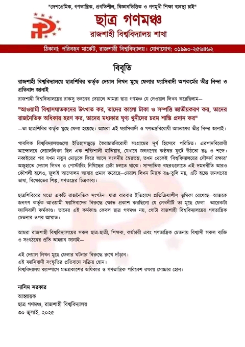 —তা ছাত্র শিবির কর্তৃক মুছে ফেলা হয়েছে। আমরা এই ফ্যাসিবাদী ও গণতন্ত্রবিরোধী আচরণের তীব্র নিন্দা জানাই।