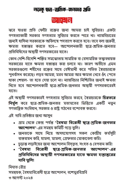 ছাত্র গণমঞ্চ বিবৃতি লড়াকু ছাত্র – শ্রমিক – জনতার প্রতি আহ্বান-ঝরে যাওয়া প্রতি ফোঁটা রক্তের জন্য আমরা চাই সুবিচার! August 3, 2024 0 comments Share this:Post Share on Threads (Opens in new window) Threads Share on WhatsApp (Opens in new window) WhatsApp Share on Telegram (Opens in new window) Telegram Email a link to a friend (Opens in new window) Email Print (Opens in new window) Print Like this:Like Loading...