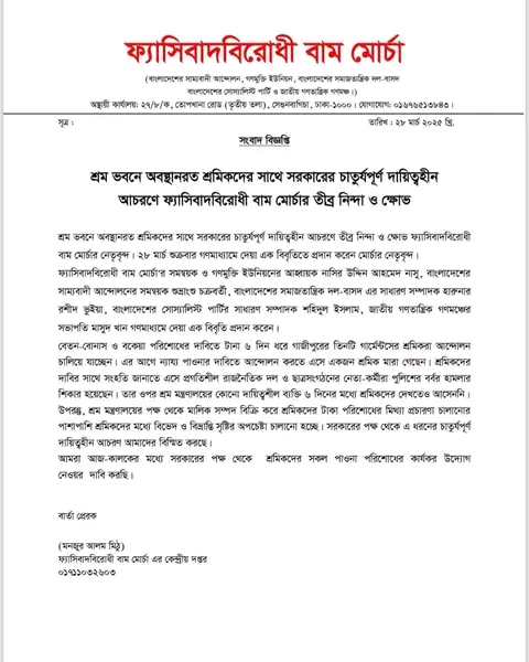 ফ্যাসিবাদবিরোধী বাম মোর্চা সংবাদ বিজ্ঞপ্তি শ্রম ভবনে অবস্থানরত শ্রমিকদের সাথে সরকারের চাতুর্যপূর্ণ দায়িত্বহীন আচরণে ফ্যাসিবাদ বিরোধী বাম মোর্চার তীব্র নিন্দা ও ক্ষোভ! March 29, 2025 0 comments Share this:Post Share on Threads (Opens in new window) Threads Share on WhatsApp (Opens in new window) WhatsApp Share on Telegram (Opens in new window) Telegram Email a link to a friend (Opens in new window) Email Print (Opens in new window) Print Like this:Like Loading...