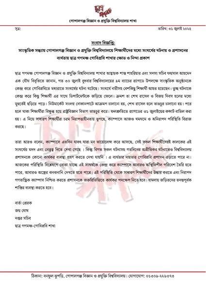 সাংস্কৃতিক সন্ধ্যায় গোপালগঞ্জ বিজ্ঞান ও প্রযুক্তি বিশ্ববিদ্যালয়ে শিক্ষার্থীদের মধ্যে সংঘর্ষের ঘটনায় ও প্রশাসনের ব্যর্থতায় ছাত্র গণমঞ্চ গোবিপ্রবি শাখার ক্ষোভ ও নিন্দা প্রকাশ